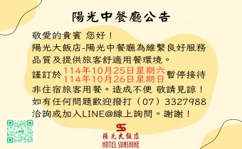 以歐式古典風格為基調,明亮挑高的空間設計,琴聲飄揚交揉著一道道灑落的陽光,美景交織廣闊的市景,優雅溫馨的用餐氣氛中,享受陽光為您提供的buffet精緻料理。